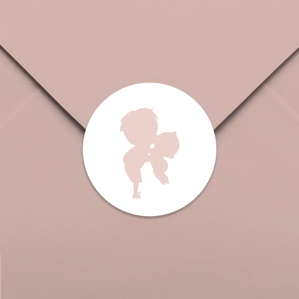 Een lieve sluitsticker met een silhouet in het roze op een witte achtergrond. Het silhouetje is van een broer die een kus aan zijn zusje geeft. De sluitstickers hebben een diameter van 35 mm en worden geleverd op vellen van 25 stuks.