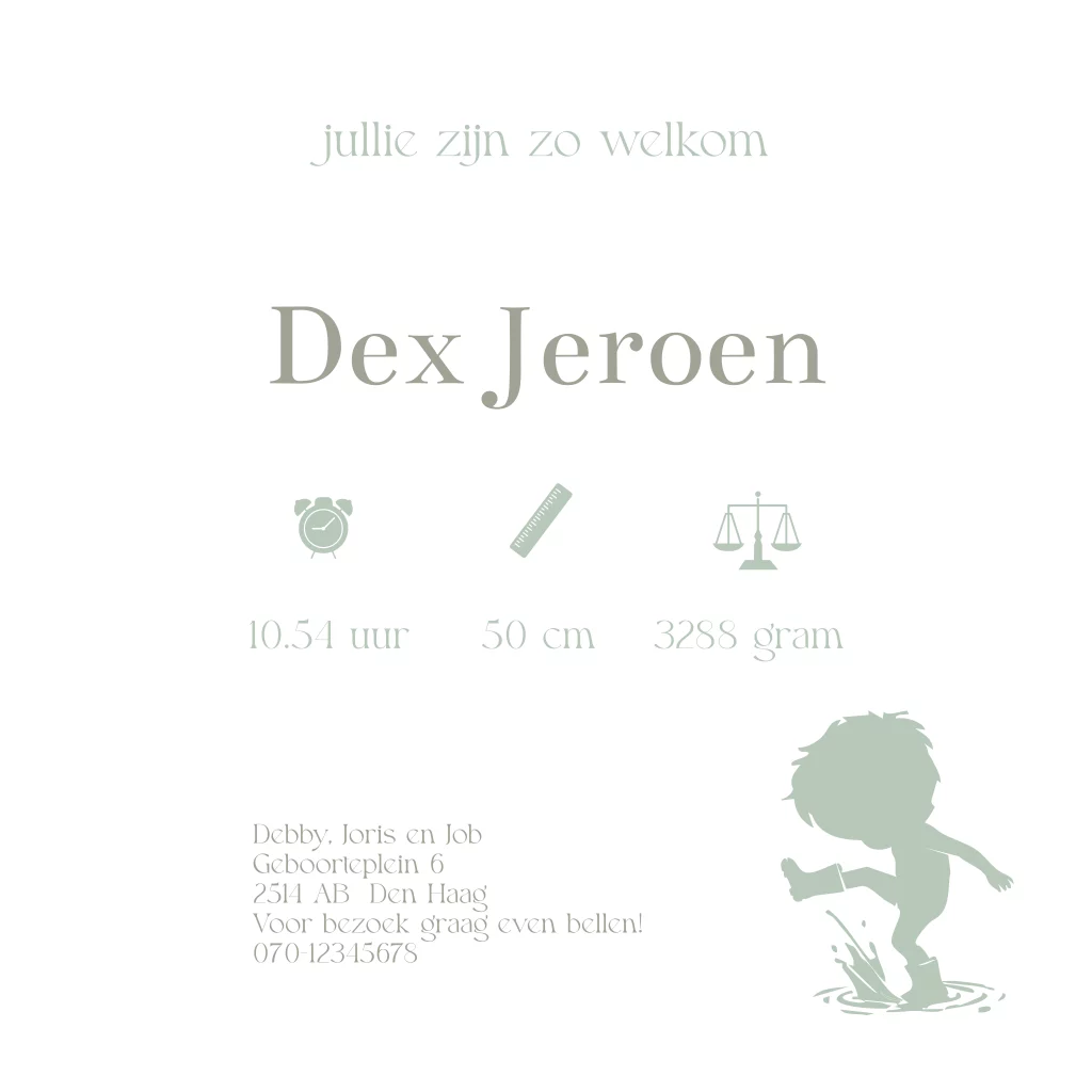 Een lief geboortekaartje voor een tweeling. Het kaartje heeft een illustratie van twee silhouetjes die met hun laarsjes lekker in de plassen aan het stampen zijn. Pas het ontwerp naar wens aan in de editor.
