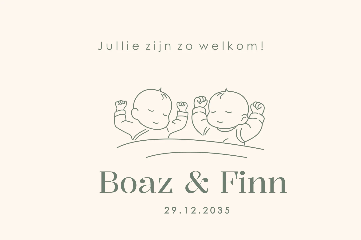Lief geboortekaartje voor een tweeling, voorzien van een subtiele lijntekening van twee slapende baby’s. Het minimalistische ontwerp straalt rust en zachtheid uit, perfect om de komst van je kleintjes op een stijlvolle manier aan te kondigen.Plaats zelf de teksten en elementen eenvoudig op de juiste plek in onze opmaaktool. Heb je hier hulp bij nodig? Neem gerust even contact met ons op!