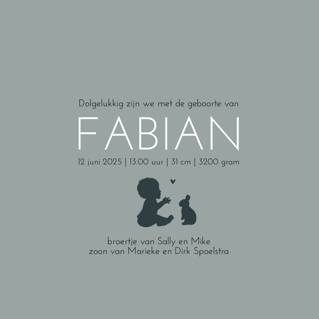Hippe geboortekaart voor de geboorte van je zoontje met een lief grijs silhouet van een klein broertje met zijn grote broer en grote zus. De hartjes op de achtergrond maken dit geboortekaartje helemaal af!