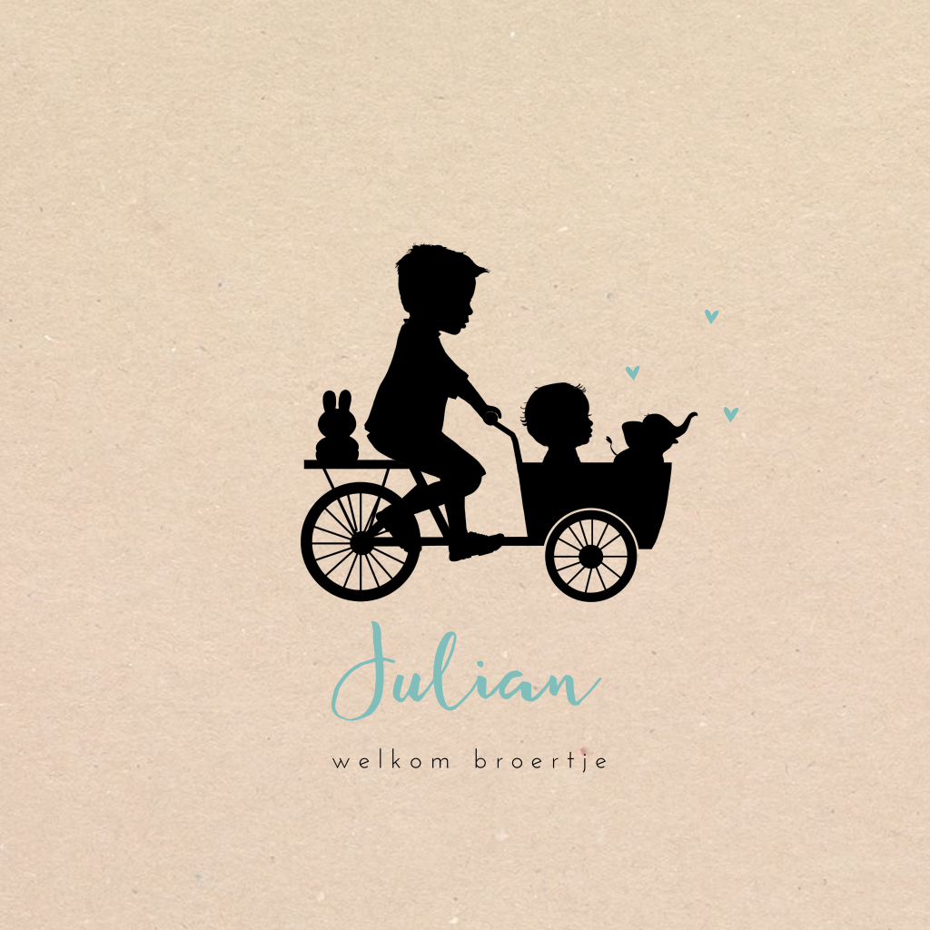 Hippe geboortekaart voor jongen met silhouet van broertjes in bakfiets