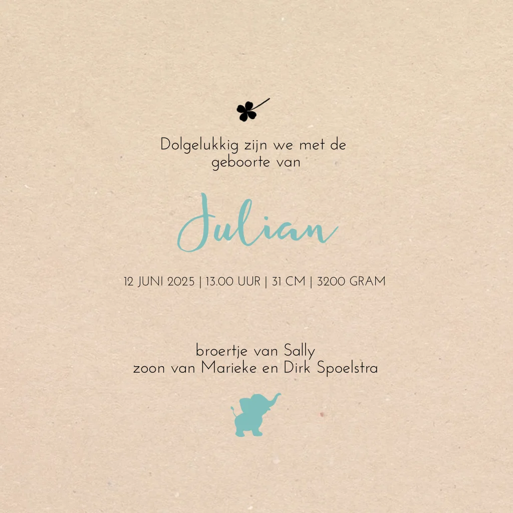 Stoere geboortekaart voor de geboorte van je zoontje met een hip silhouet van een grote zus en broer met hun kleine broertje met zijn olifant knuffel in de bakfiets.