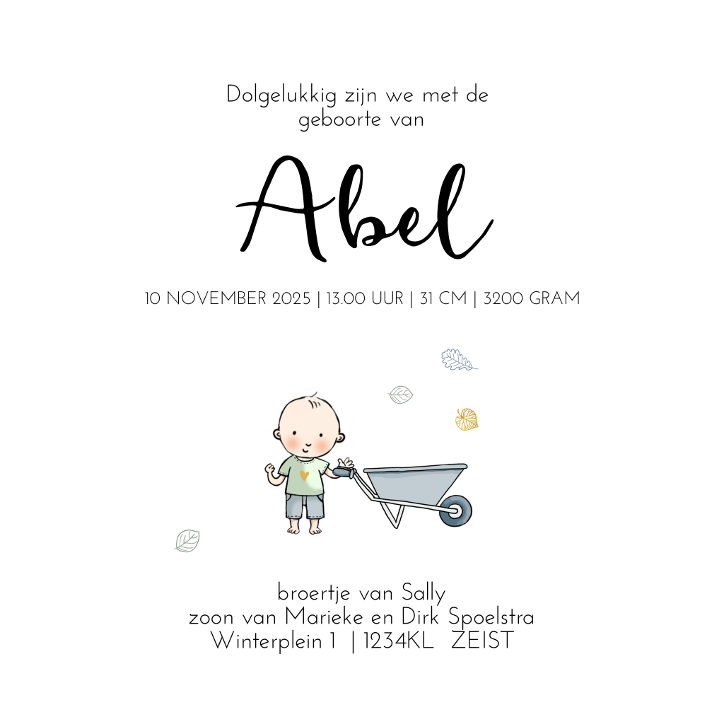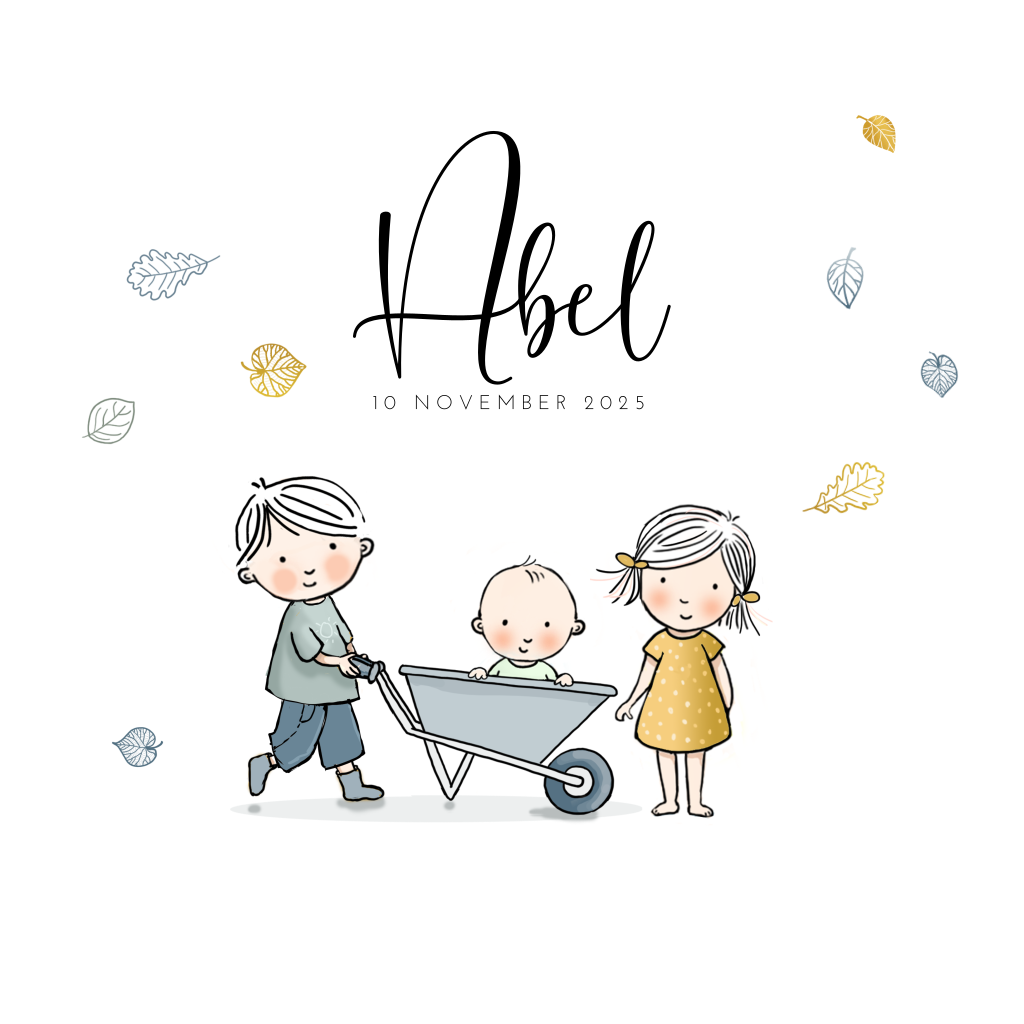 Schattig geboortekaartje voor je pasgeboren zoontje. Met een vrolijke tekening van een grote broer en groze zus met hun kleine baby broertje in een kruiwagen. Met de blauwe en gele bladeren is dit echt een herfst geboortekaartje!