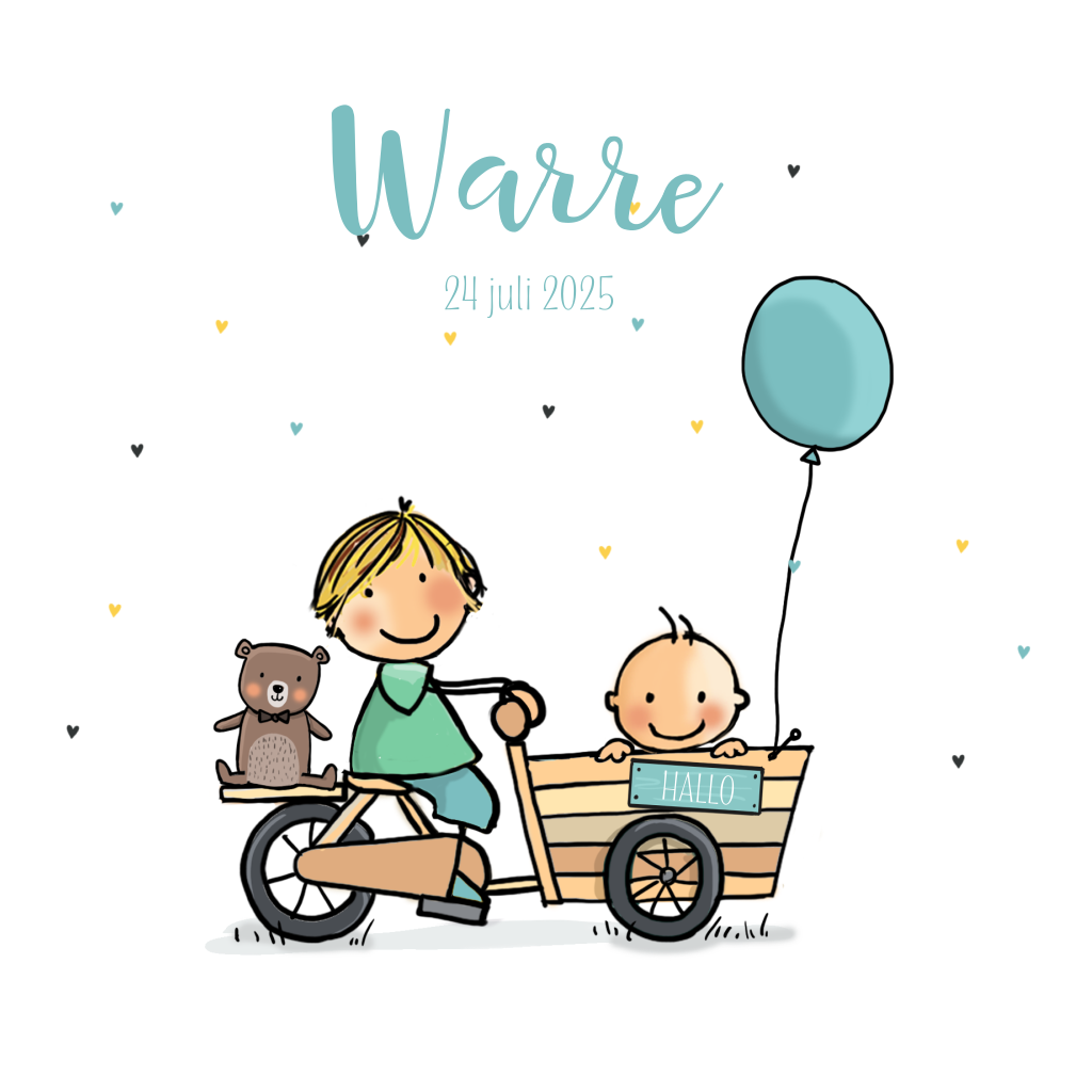 Mooi, uniek en hip geboortekaartje met een vrolijke illustratie van een klein broertje in de bakfiets met zijn grote broer, teddy beer en ballon. Met lieve gekleurde hartjes patroon op de achterkant.