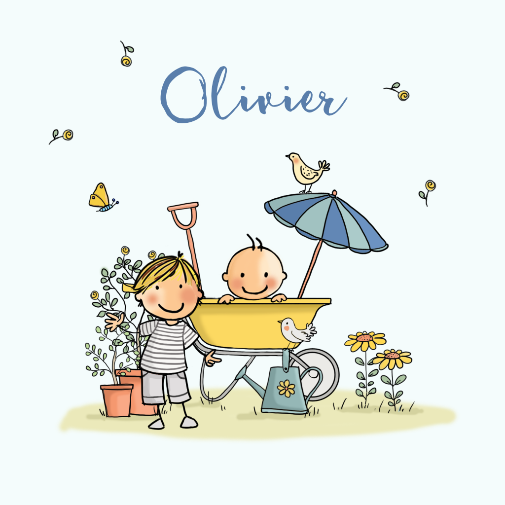 Super lief zomer kaartje voor je zoontje met vrolijke illustratie van grote broer met zijn kleine broertje in de tuin in een grappige kruiwagen met parasol. Daarnaast zijn er leuke illustraties van bloemetjes, vogels, en vlinders.