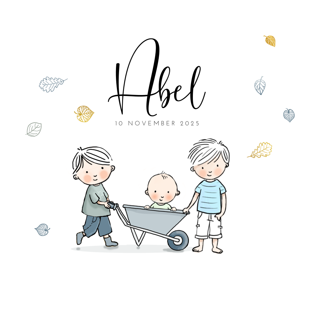 Lief getekend geboortekaartje voor de geboorte van je derde zoontje met een illustratie van twee grote broers met hun baby broertje in de kruiwagen. De bladeren dwarrelen al naar beneden en maken dit een echt herfst geboortekaartje!
