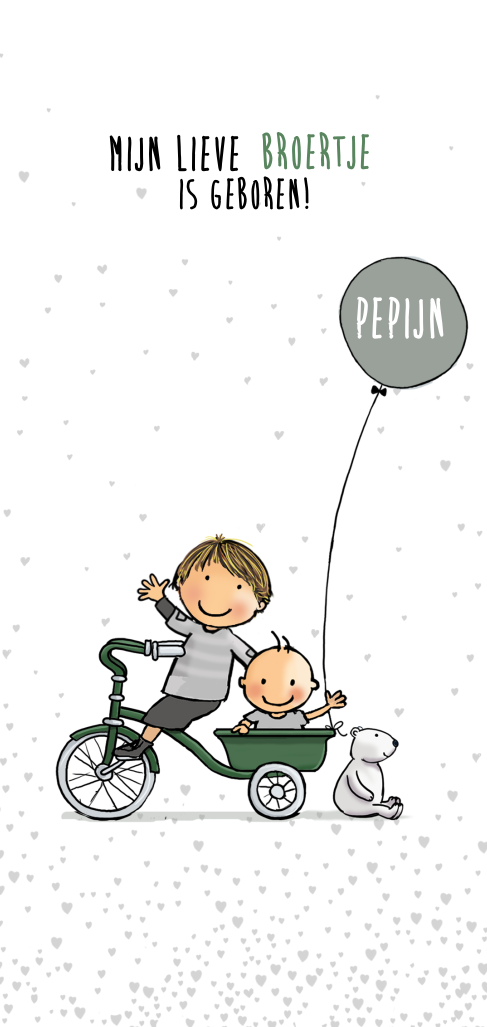 Super lief geboortekaartje van broertje met baby broertje in fietsbakje met ballon, lieve ijsbeer en hartjes.