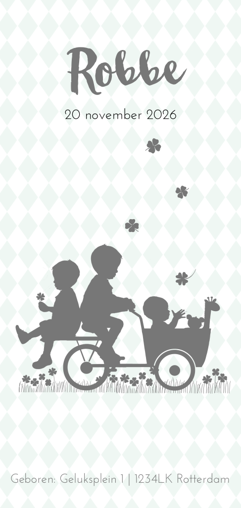 Lief geboortekaartje voor een derde kindje met broertje in bakfiets met giraf en beer knuffel. De silhouetten steken stoer af op de mintgroene chevron achtergrond.
