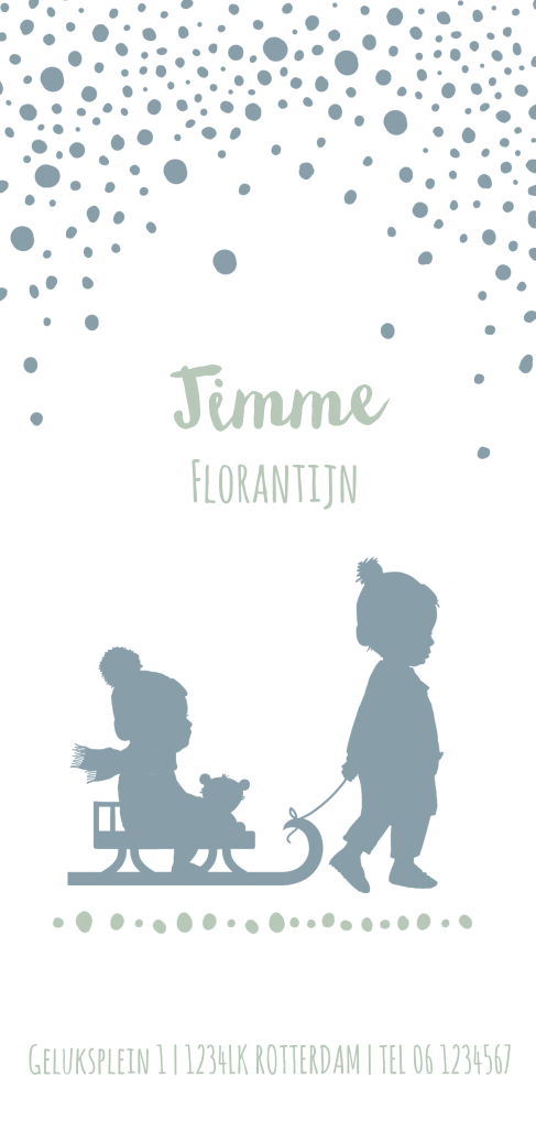 Super stoer geboortekaartje van een baby op een slee met stoer broertje met muts. De blauwe en groene kleuren in het kaartje kun je eventueel aanpassen in de editor. Ook dé trend van nu komt terug: silhouet.