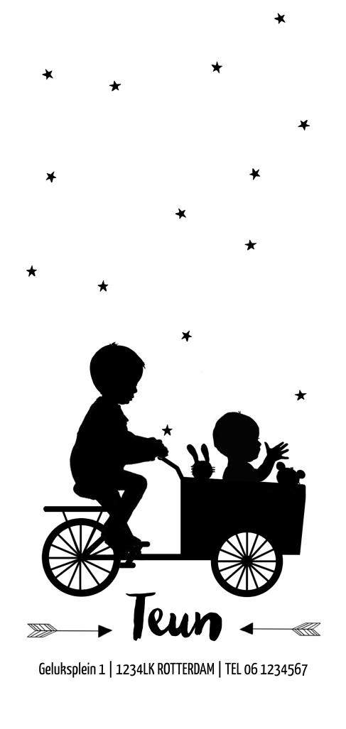 Super stoer geboortekaartje van een baby in bakfiets met fietsend broertje en sterretjes in hippe zwart wit look. Ook de hippe 'silhouet' trend komt terug in dit kaartje.