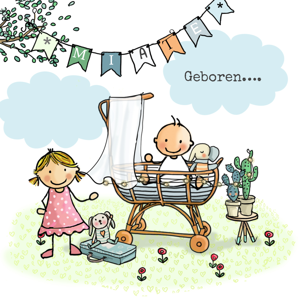 Lief babykaartje met tekening van een jongens baby in een retro Rotan wiegje met zijn grote zus ernaast. Deze vrolijke kaart zit vol met leuke kleurijk geïllustreerde elementen.