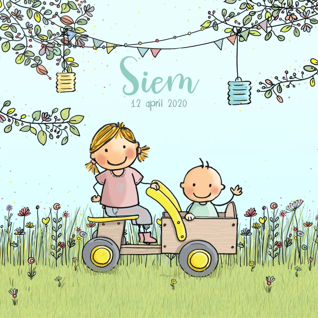 Super lieve geboortekaart voor de geboorte van je zoon met een illustratie van een klein broertje die samen met zijn grote zus in een houten fiets kar zit. De slingers bloemen en lampionnen maken het een zomers, kleurrijk en feestelijk geheel.