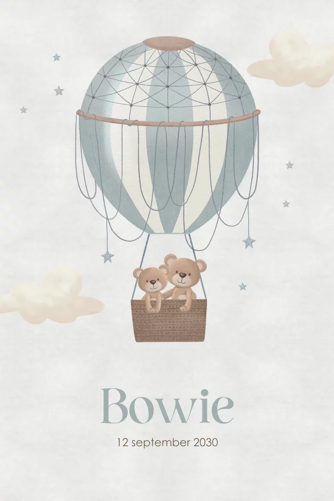 Het kaartje heeft blauwe tinten. In het midden zie je een luchtballon vliegen tussen de wolkjes. In de luchtballon zitten twee beertjes. Pas het ontwerp naar wens aan in onze online editor.Dit product maakt onderdeel uit van deze set.