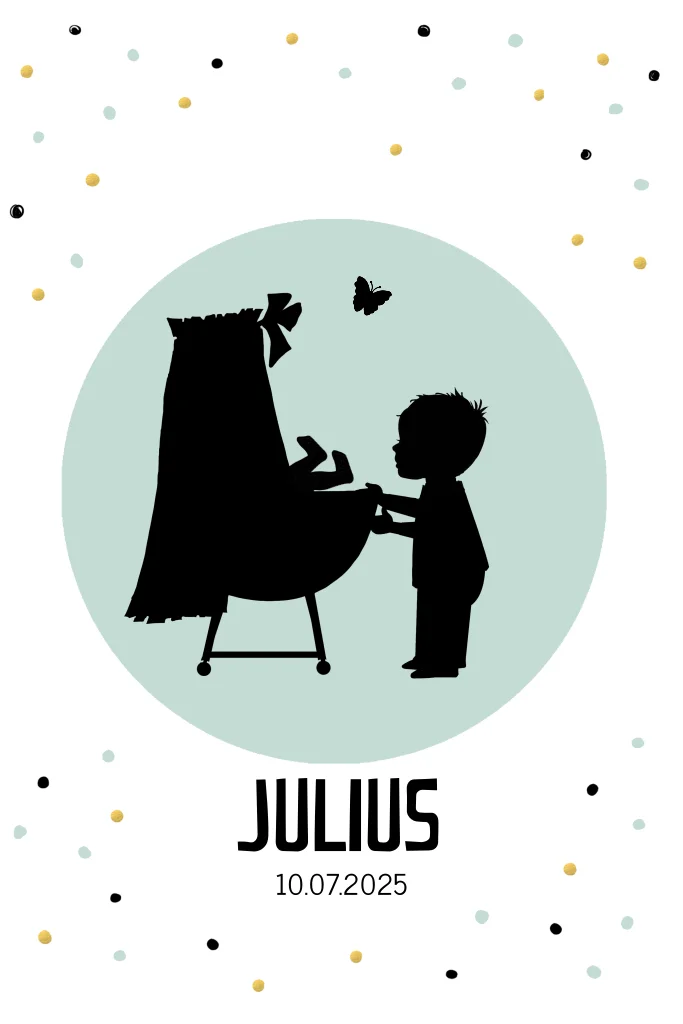 Hippe geboortekaart broertje silhouet met wiegje en broer