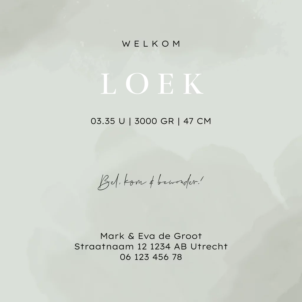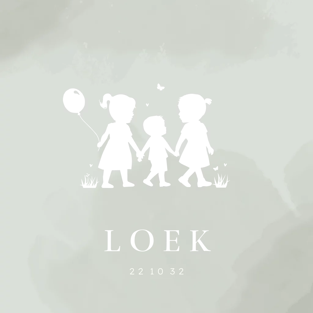 Een schattig en trendy geboortekaartje voor jullie derde kindje. Het kaartje heeft een groen/grijze watercolour achtergrond. Daarop zijn drie goudfolie silhouetjes te zien van twee grote zussen met hun kleine broertje.