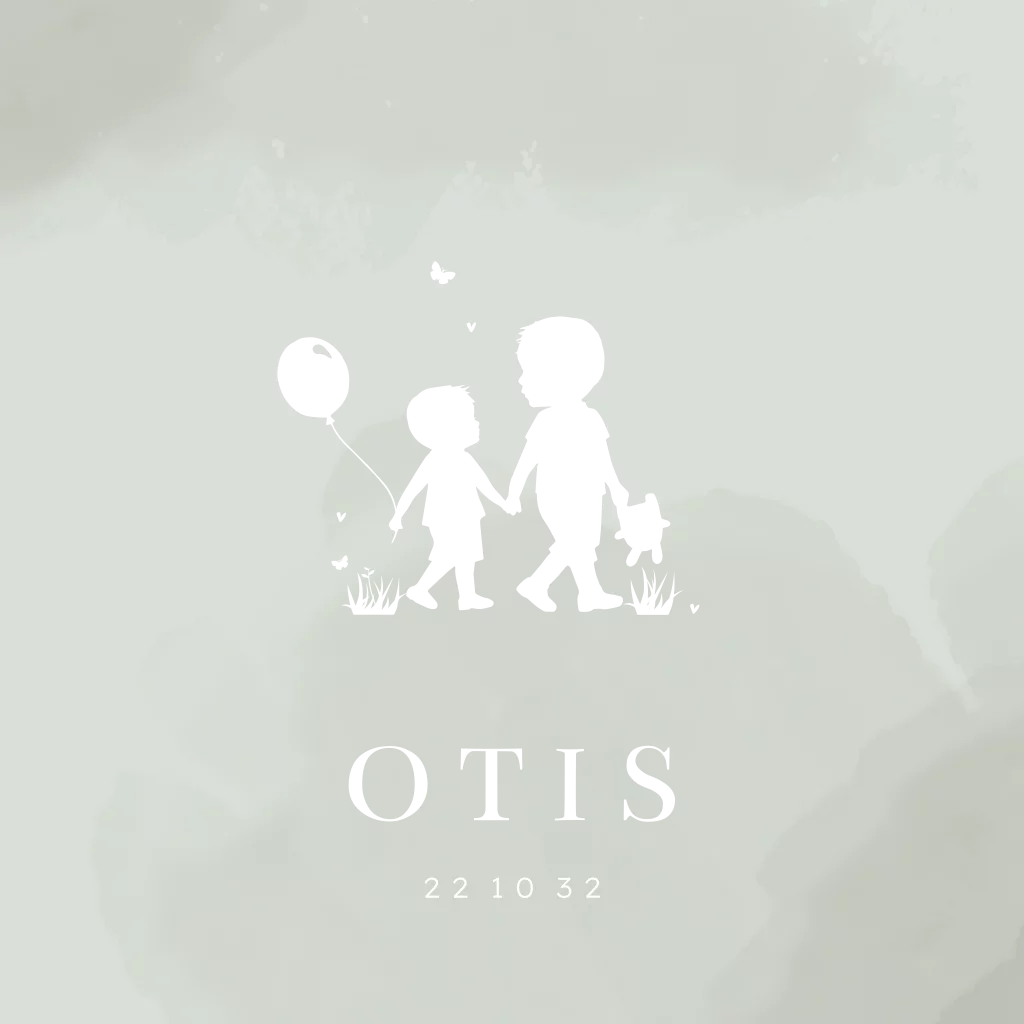 Een goudfolie geboortekaartje voor jullie tweede kindje. Op het kaartje zie je schattige silhouetjes van jullie eerste zoon en tweede zoontje hand in hand. De achtergrond heeft een groen/grijze watercolour.