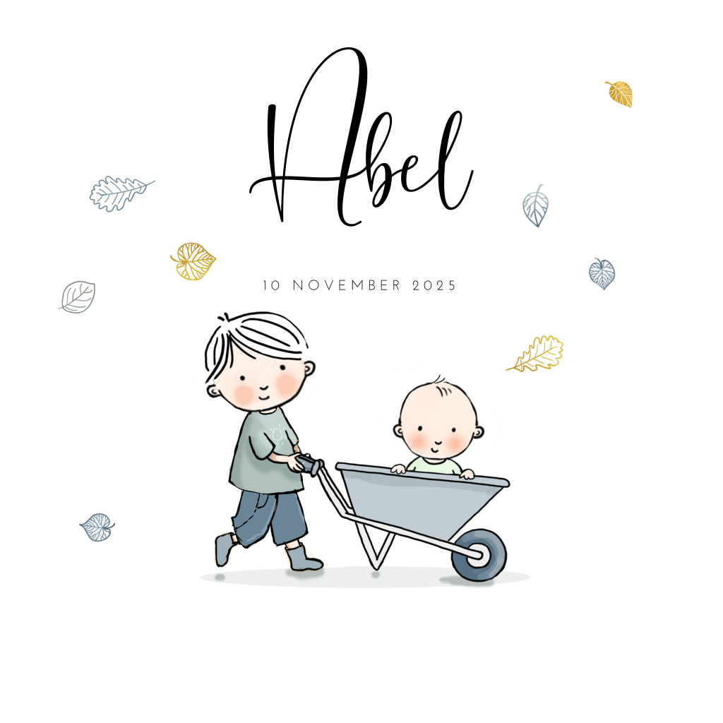 Getekend geboortekaartje voor de geboorte van een kleine jongen. Het babybroertje wordt door zijn broer in de kruiwagen geduwd. Mooi zijn de bruin- en grijstinten die terugkomen in de illustratie en de daaromheen dwarrelende, fijngetekende blaadjes.