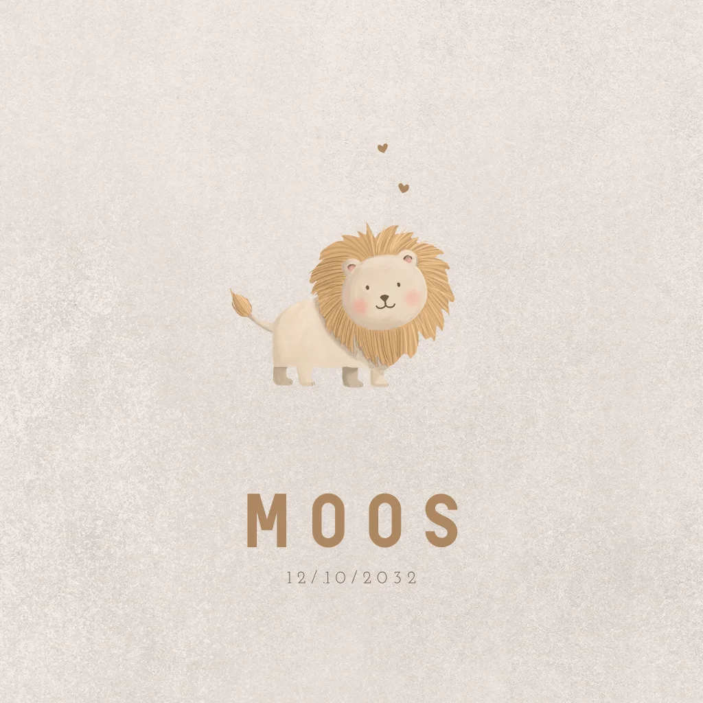 Een vrolijk geboortekaartje voor jouw zoon. Het kaartje heeft een beige velvet-look achtergrond met ronde hoeken. In het midden zie je een schattige illustratie van een leeuwtje. Pas het kaartje naar wens aan in onze online editor.