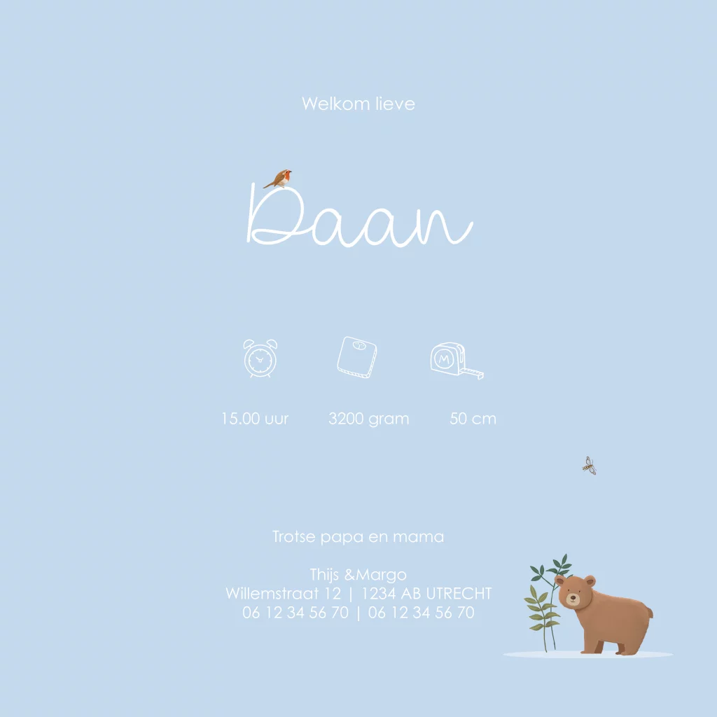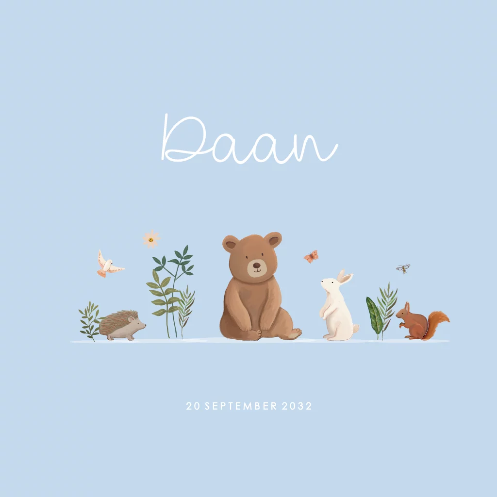 Kondig de geboorte van je zoon aan met dit lieve kaartje. Het kaartje heeft een blauwe achtergrond met de illustraties van verschillende bosdieren. Pas het kaartje aan in onze online editor, bestel een proefdruk en bewonder dit kaartje in het echt!