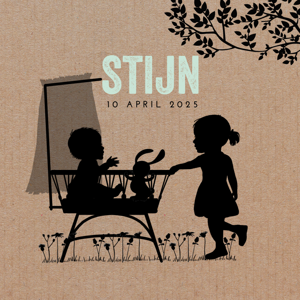 Wat een hip geboortekaartje van kraft met een silhouet van een meisje bij de wieg van haar babybroertje! De boomtak is ook mooi. Teksten en lettertypes pas je naar wens aan. Iets voor jouw zoontje?