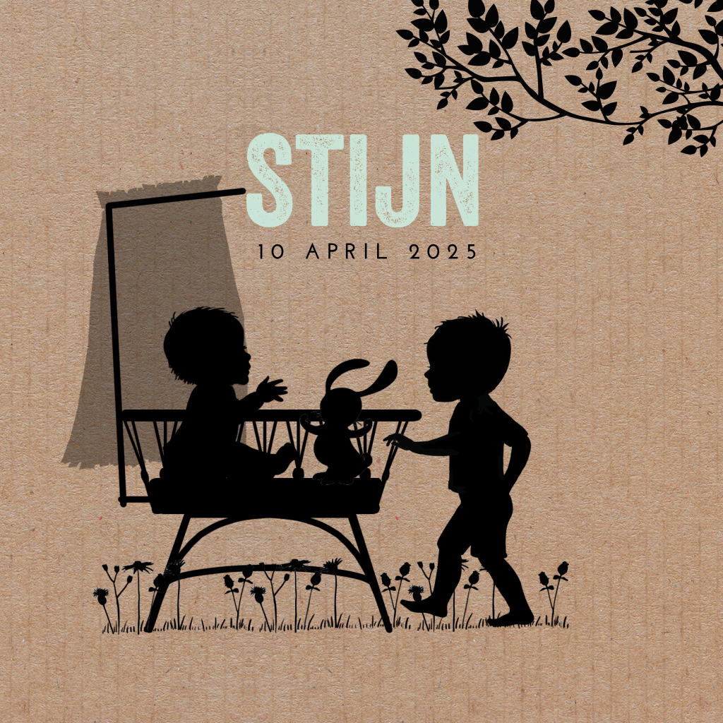 Een geboortekaartje van kraft met een silhouet van een grote broer bij de rotanwieg van zijn kleine babybroertje: wat lief! Ook tof is de boomtak en de plantjes. Een hip kaartje voor een jongen!