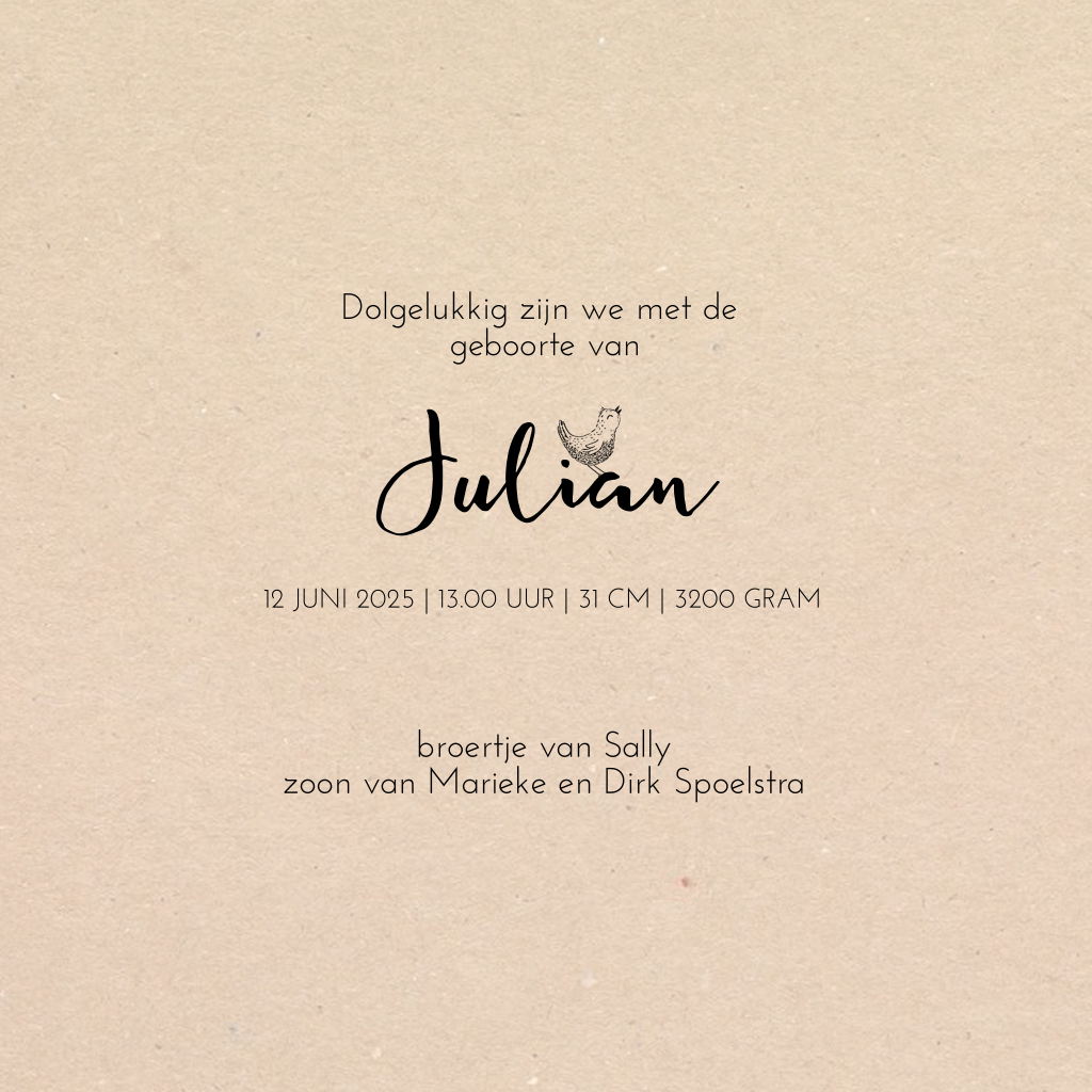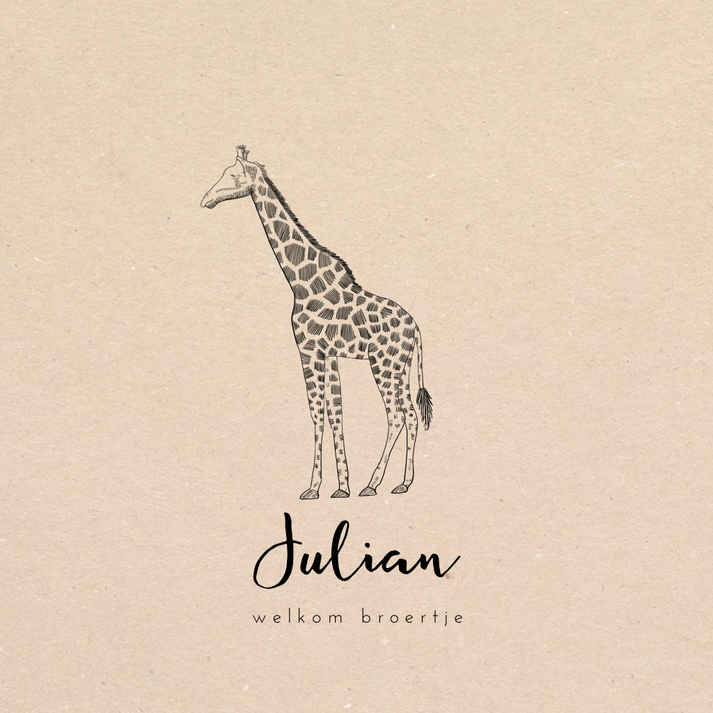 De zwarte tekening van een giraffe op dit babykaartje staat super mooi op de kraftlook achtergrond! Aan de binnenkant van het kaartje staan ook tekeningen van een beertje en vogel. Bewerk dit kaartje naar wens in de online editor.