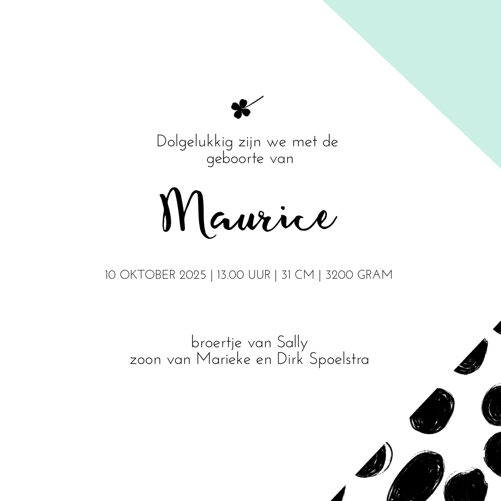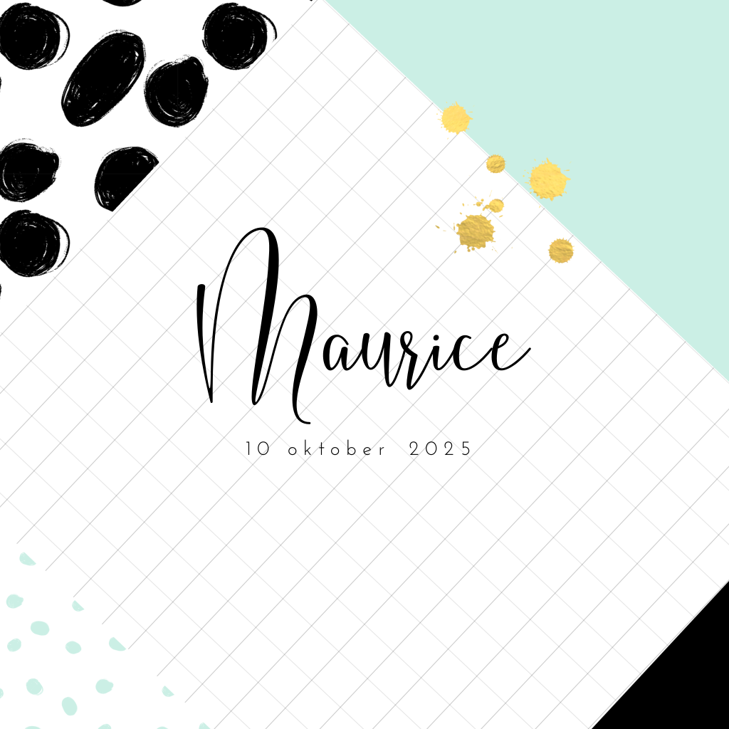 Wat een moderne look heeft dit geboortekaartje! Met geometrische vlakken, diverse patroontjes en een hippe kleurencombinatie van zwart, wit en mintgroen. Het stijlvolle lettertype in combinatie met de verfspetters in goudlook maken dit kaartje helemaal af!