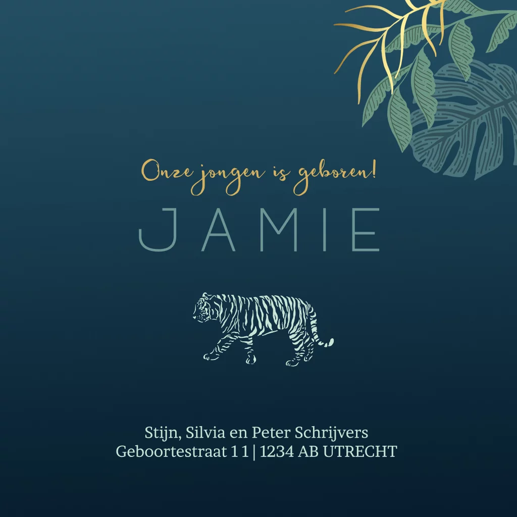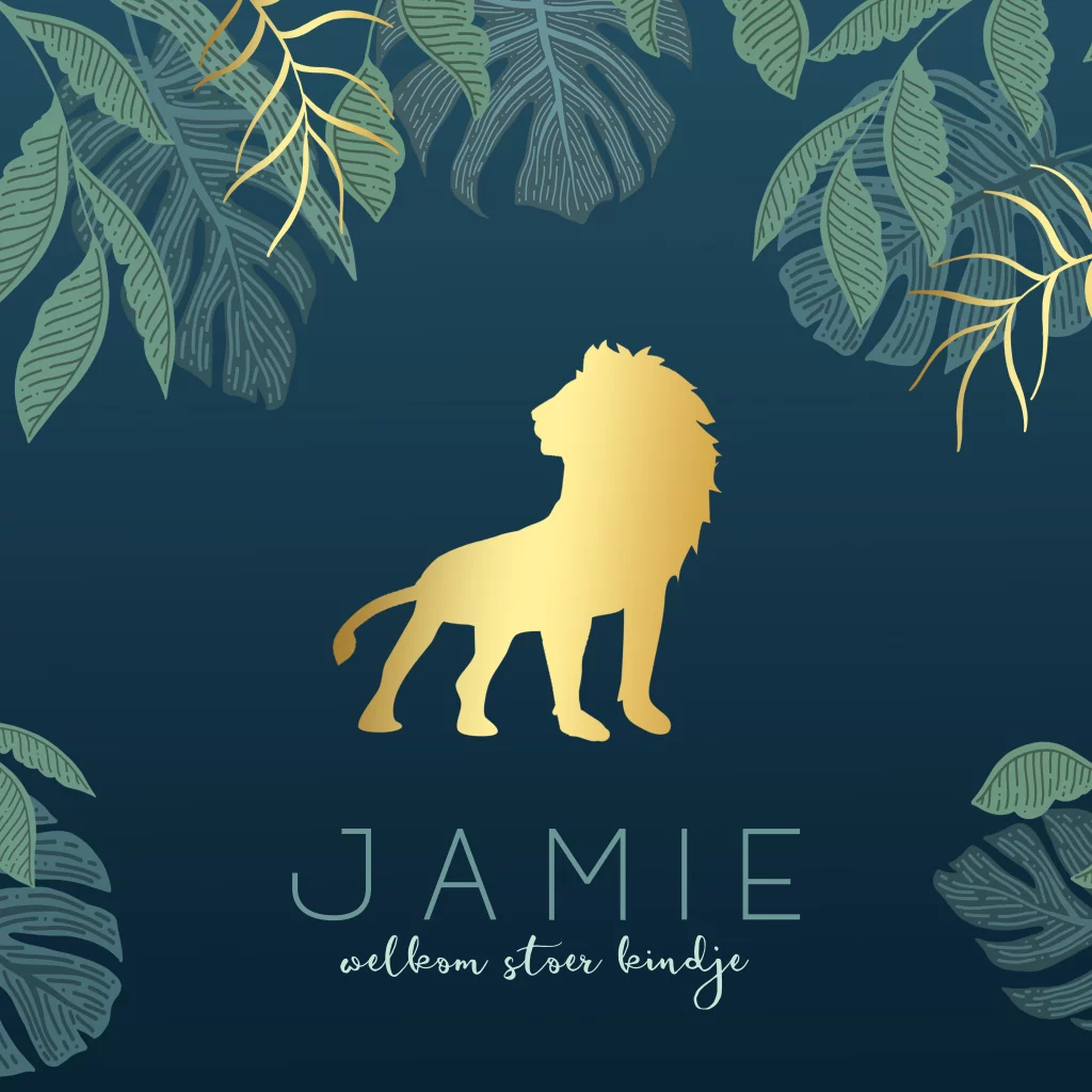 Stoer jungle dieren geboortekaartje voor je zoon met een trendy gouden silhouet van een leeuw met jungle bladeren op een donkerblauwe achtergrond.