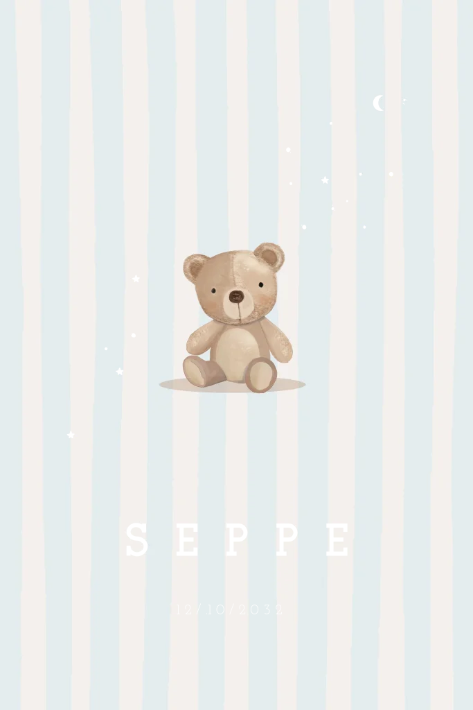 Een lief en stijlvol geboortekaartje met een zacht karakter. Op de voorkant staat een schattig beertje, omringd door subtiele sterretjes die zorgen voor een magische uitstraling. De achtergrond is afgewerkt met blauwe strepen, wat het kaartje een frisse en tijdloze look geeft. De naam van jullie kindje wordt in prachtige koperfolie gedrukt, waardoor deze een luxe accent toevoegt. Een mooie aankondiging van jullie kleine wonder!Plaats zelf de teksten en elementen eenvoudig op de juiste plek in onze opmaaktool. Heb je hier hulp bij nodig? Neem gerust even contact met ons op!