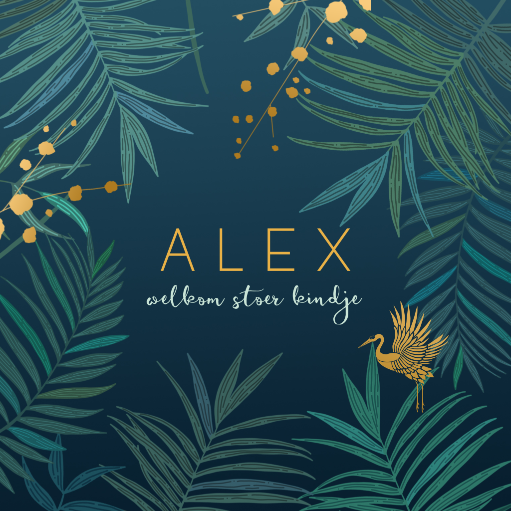 Botanische geboortekaartje met hippe takjes en bladeren op donkerblauwe achtergrond. Met de goudlook verfspatten en kraanvogel past dit geboortekaartje helemaal bij de jungle trends!