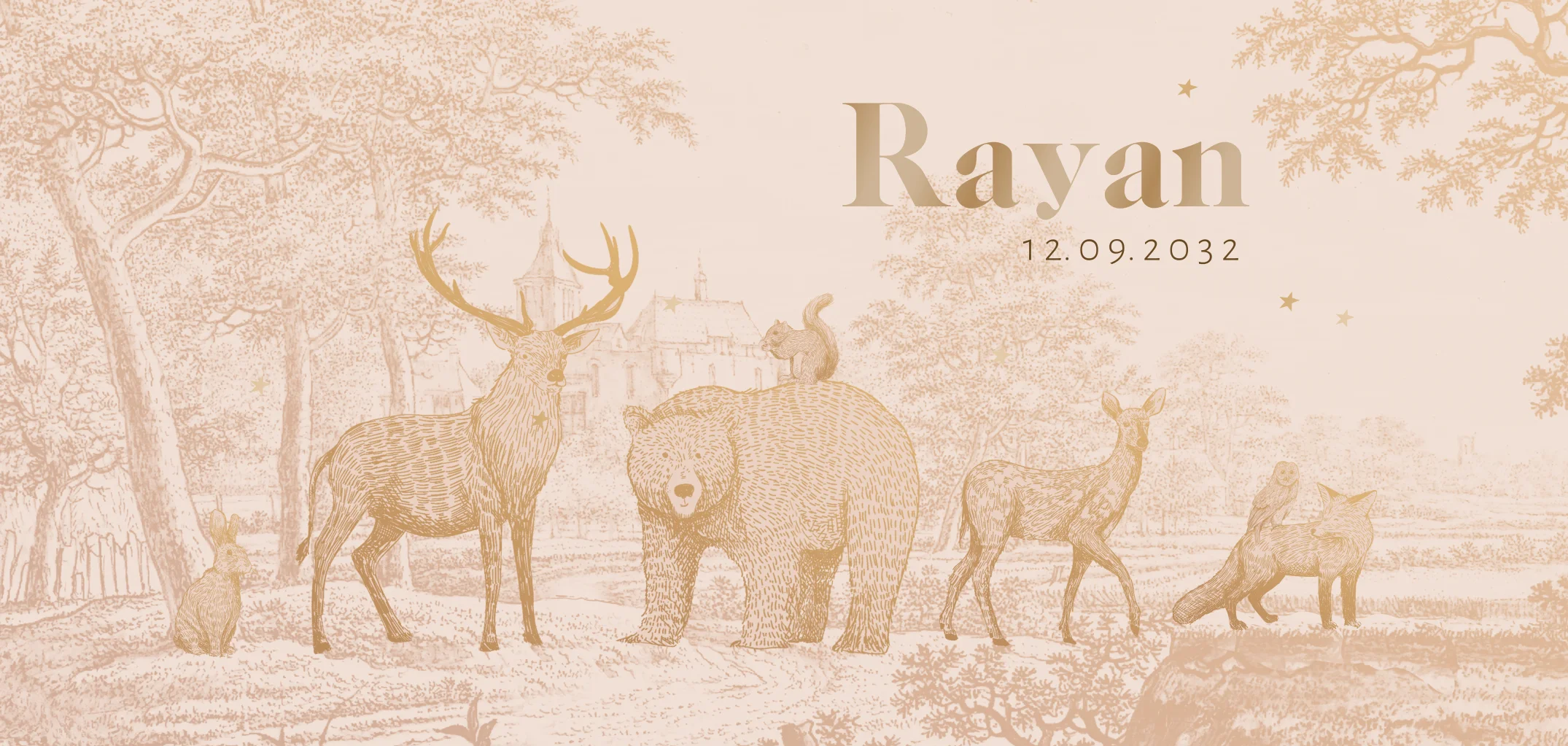 Dit prachtige geboortekaartje met een klassieke pentekening van bosdieren zoals een hert, beer, vos, eekhoorn en konijn is perfect voor de geboorte van een jongen. De lichte beige en bruine tinten geven het kaartje een elegante uitstraling. Personaliseer het kaartje met de naam van je baby en maak het helemaal uniek.
