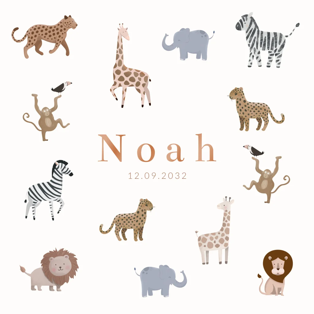 Geboortekaartje met gekleurde jungledieren en hoogglans