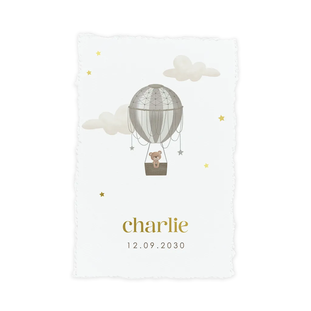 Wat een lief geboortekaartje! Het kaartje heeft een witte achtergrond met daarop de illustratie van een beertje in een luchtballon met foliedruk voor een luxe finish. Het kaartje heeft een geschept papier look die je zelf aan het kaartje geeft. Al onze kaartjes met handgeschept papier vind je hier. Let hierbij op de volgende dingen: