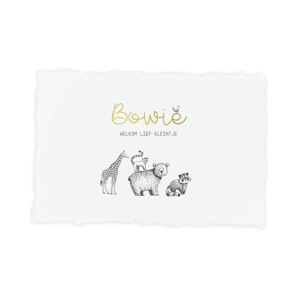 Wat een lief geboortekaartje! Het kaartje heeft een witte achtergrond met daarop illustraties van verschillende dieren. Het kaartje heeft een geschept papier look die je zelf aan het kaartje geeft. Al onze kaartjes met handgeschept papier vind je hier. Let hierbij op de volgende dingen: