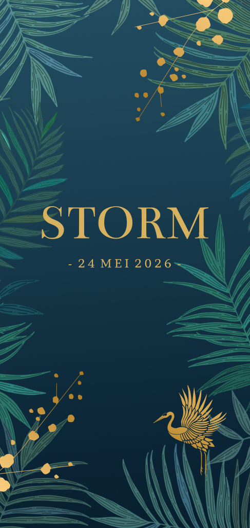 Trendy geboortekaartje voor je zoontje met jungle bladeren en een goudlook kraanvogel op een donkerblauwe achtergrond.