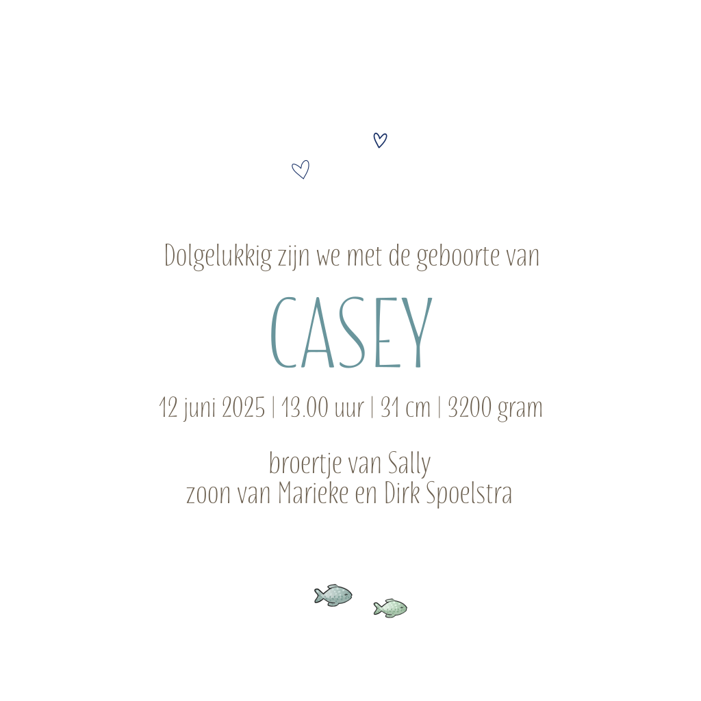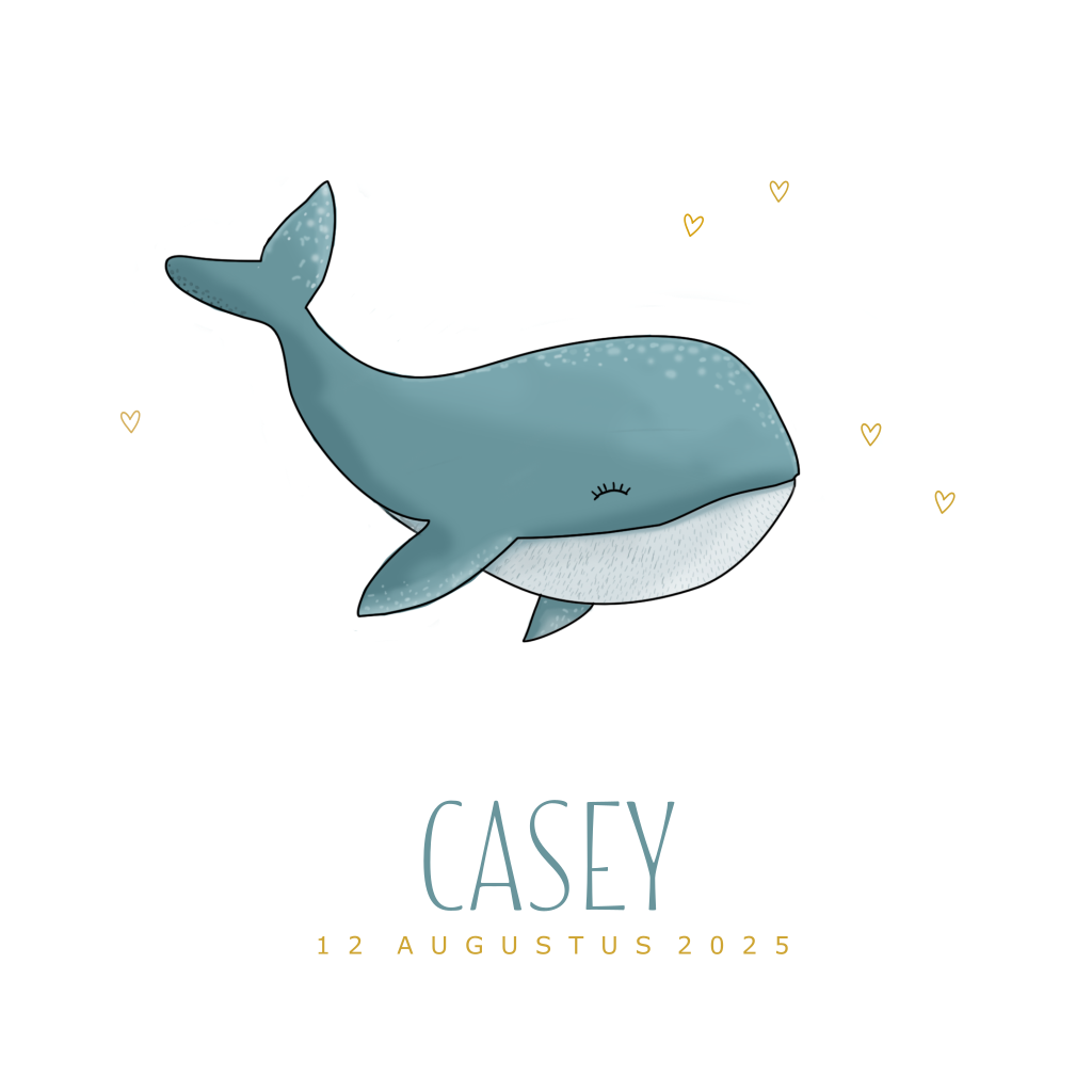 Illustratief geboortekaartje voor een jongen met een illustratie van een walvis en kleine goudlook hartjes. Verander de achtergrondkleur en schrijf je eigen teksten om een persoonlijk geboortekaartje te maken!