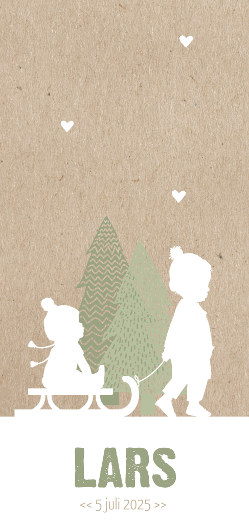 Deze hippe geboortekaart is heerlijk winters: twee broertjes lopen met de slee op het ijs met op de achtergrond kerstbomen! Tof is ook het kraftpapier met hartjes. Leuk voor de geboorte van een zoontje!
