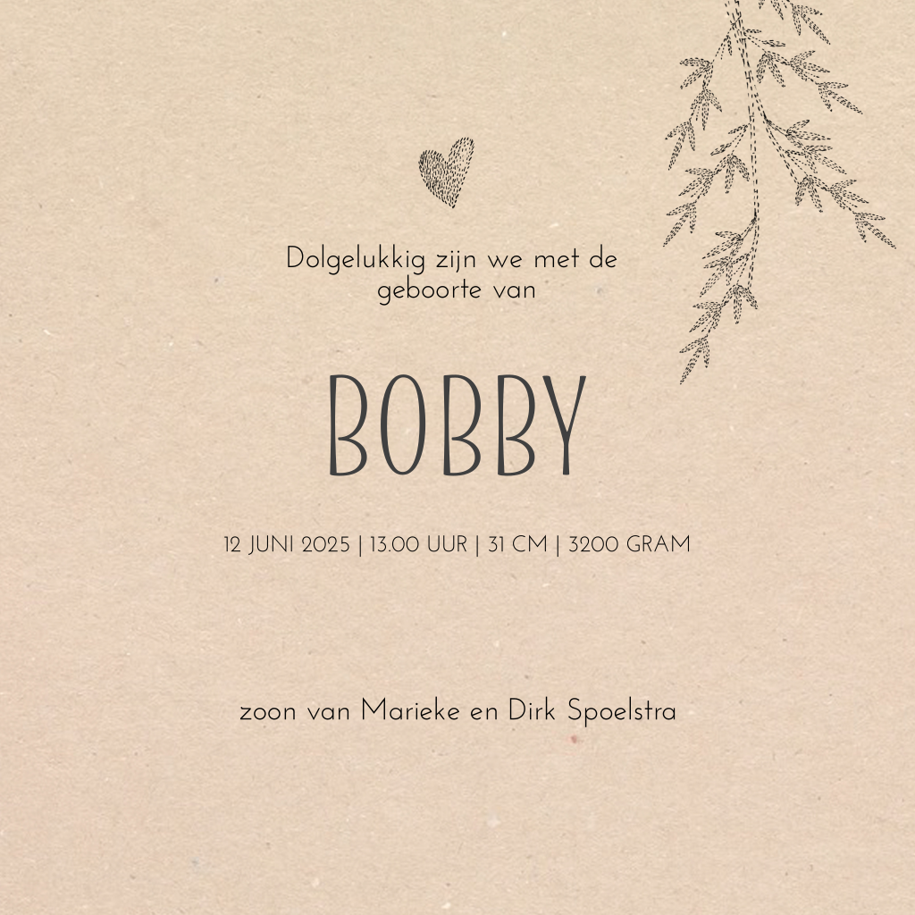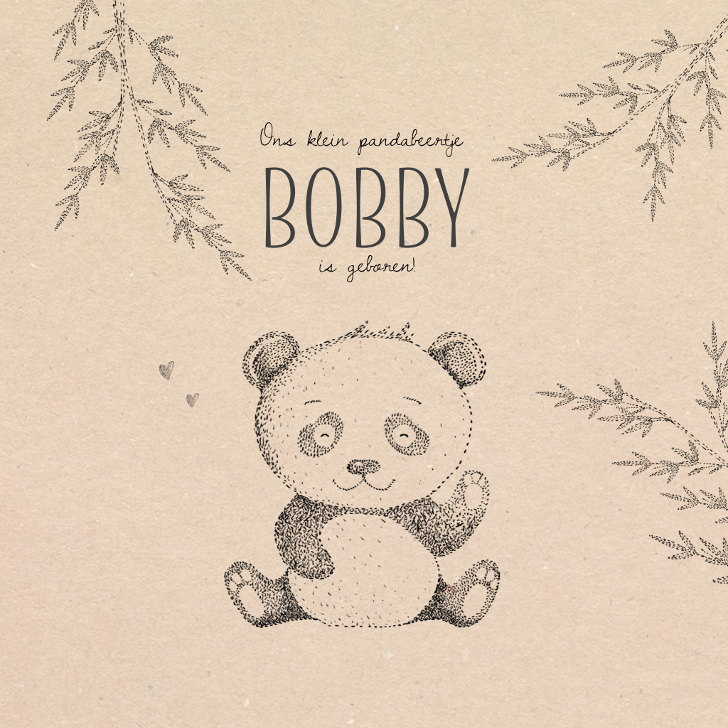 Wat een leuk pandabeertje op dit lieve babykaartje! Het beertje is getekend met zwarte pen. Dit geeft het kaartje in combinatie met de kraft look achtergrond een mooie uitstraling. De takjes en kleine hartjes maken het kaartje helemaal af. Pas de teksten naar wens aan in de online editor.