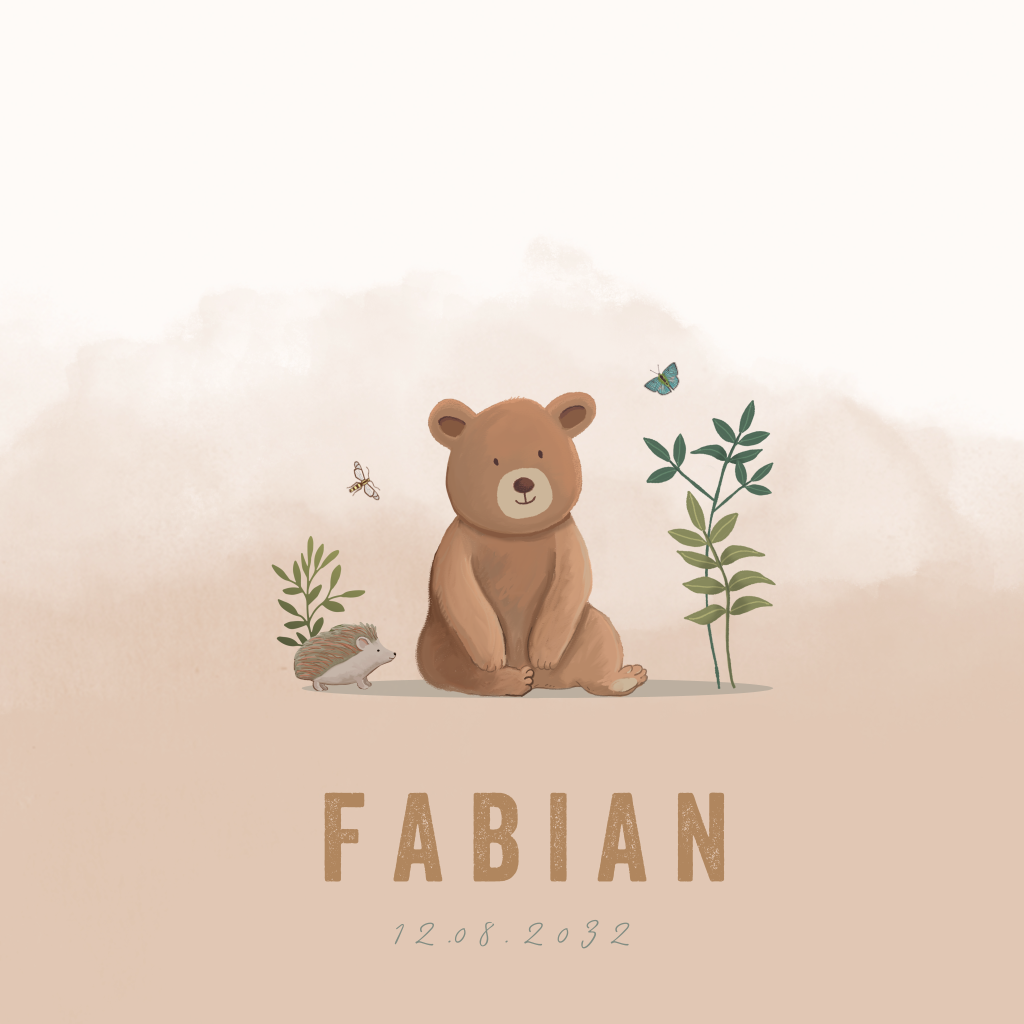 Wat een lief geboortekaartje voor jouw kindje. Het geboortekaartje heeft een bruine watecolour achtergrond. Op de voorgrond zie je een lief beertje met een egeltje tussen de takjes. Het kaartje is volledig naar wens te personaliseren.