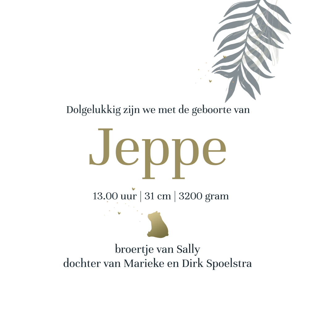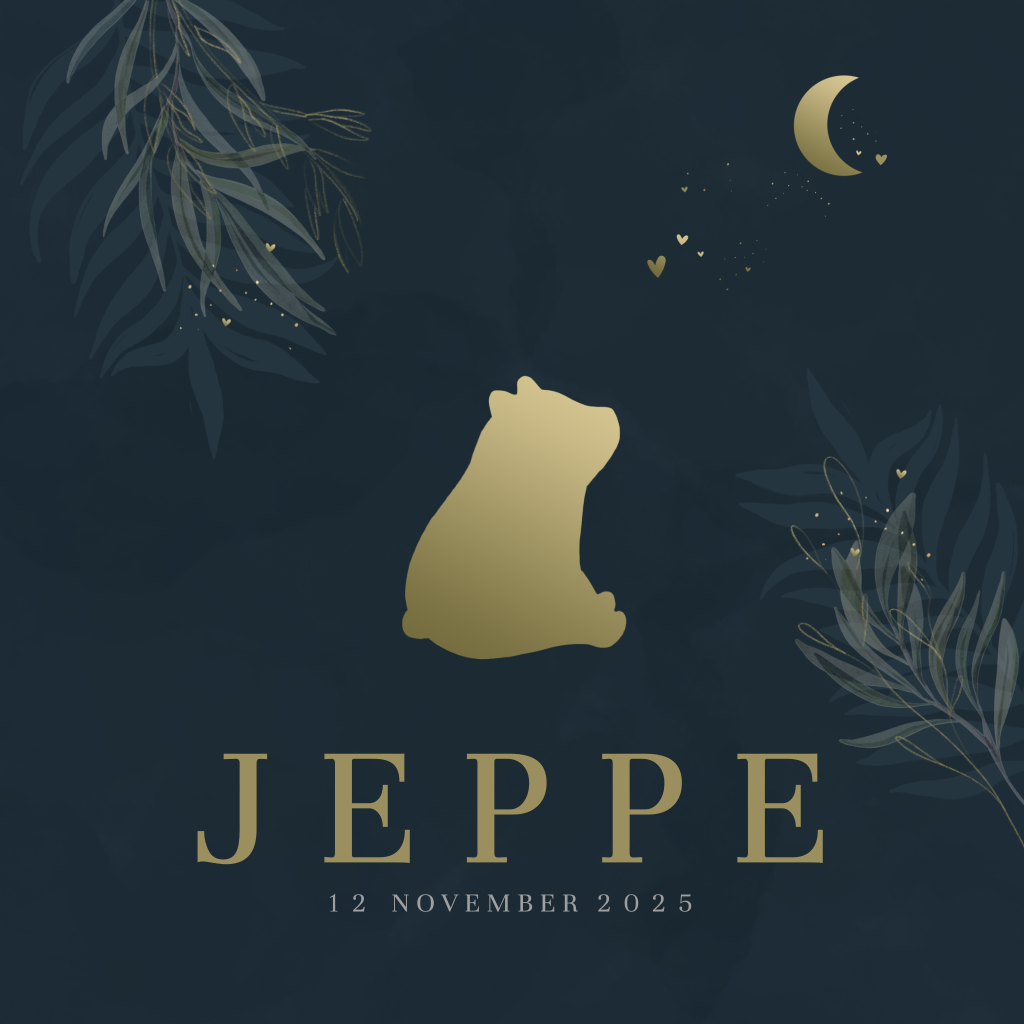 Dit is een stoer kaartje voor jullie pasgeboren zoontje. Het kaartje heeft een donkere achtergrond met goudkleurige beer, maan en naam. Pas het kaartje naar wens aan in onze online editor en bestel snel een proefdruk om dit kaartje in het echt te zien!