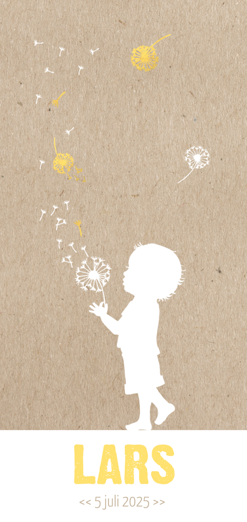 Hip en origineel geboortekaartje met silhouet van een kindje en paardenbloemen! Je kunt kleuren en lettertypes eventueel naar wens aanpassen in de online-editor.