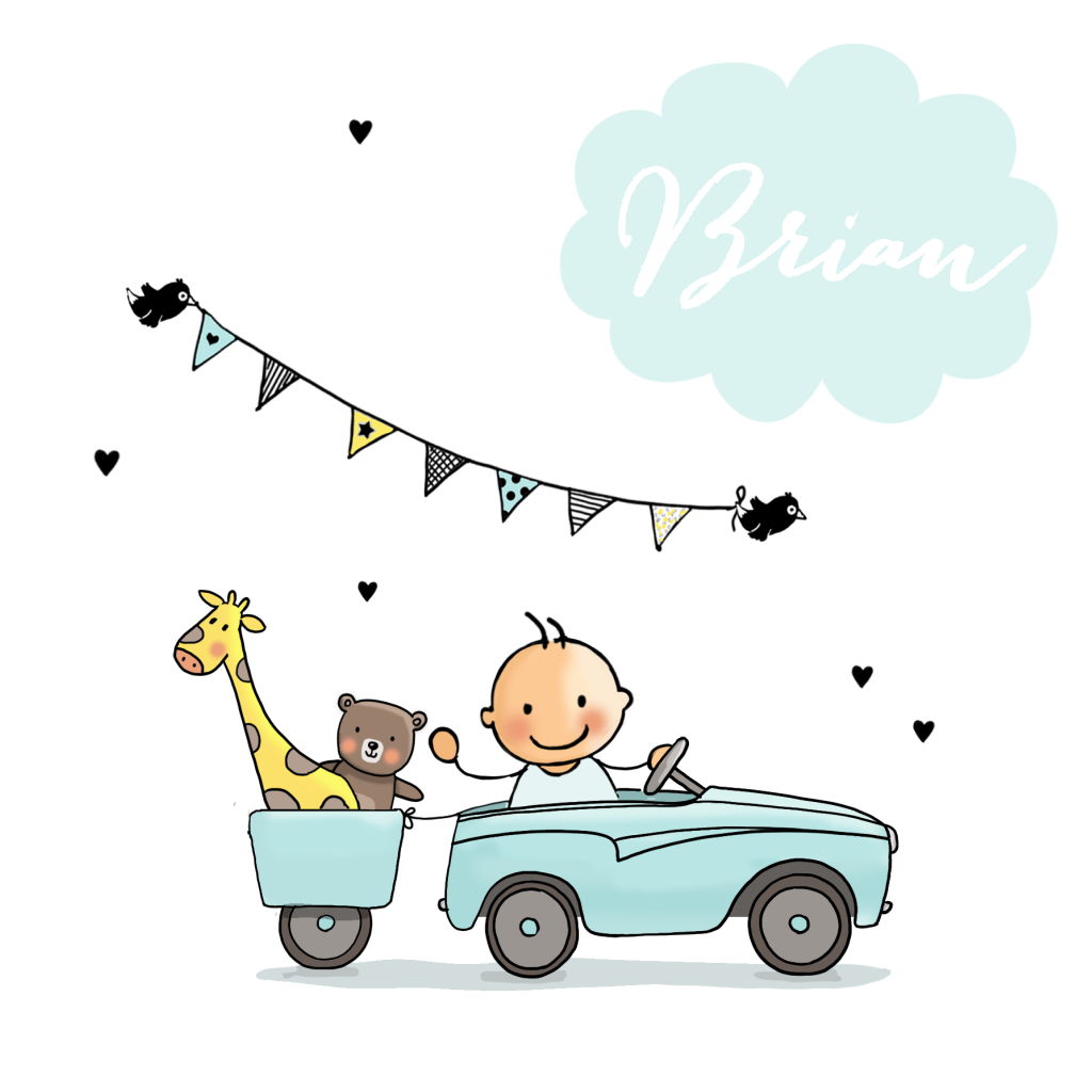Mooi, hip en vrolijk geboortekaartje met grappige illustraties van een jongetje in een trap autootje met aanhangwagen met daarin een giraffe en beertje. Op de achtergrond staan tekeningetjes van vogels met vlaggetjes, hartjes en een wolk.