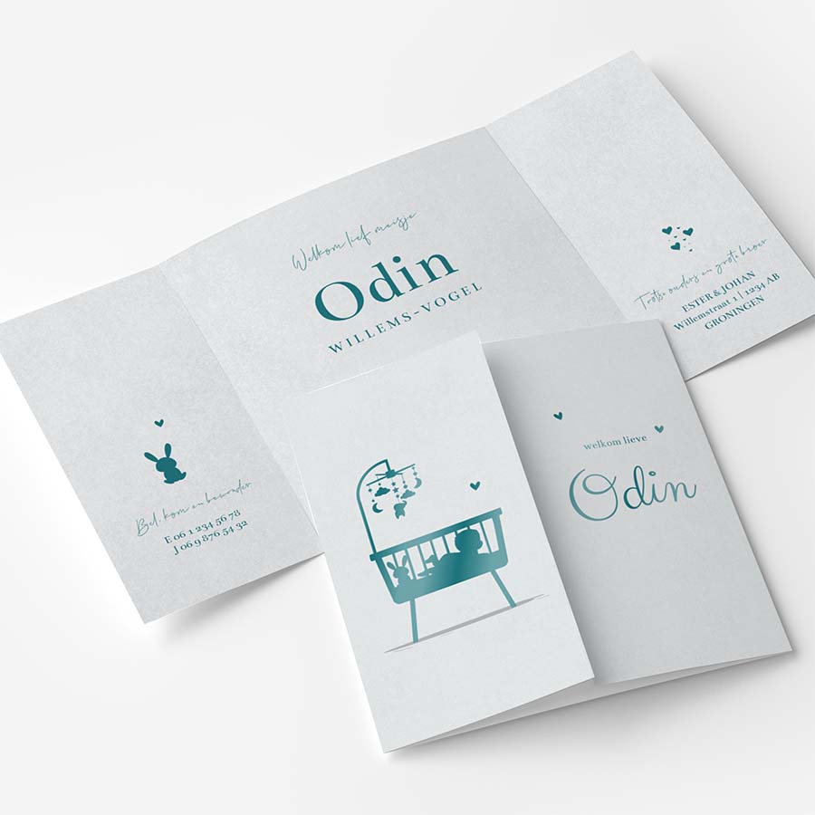 Hoe mooi: dit theatervouw geboortekaartje ontvouwt zich als een klein kunstwerk. Het kaartje heeft een mooie blauwe kleur met daarop het silhouet van een baby in een ledikantje. De letters in hoogglans geven een luxe finish. Bewerk het ontwerp naar wens in de online editor.