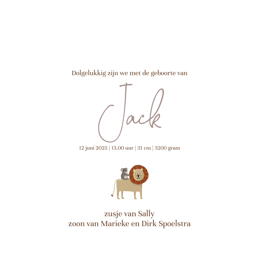 Dit is een avontuurlijk geboortekaartje voor jullie pasgeboren zoon. Het kaartje heeft een lichte achtergrond waartegen de getekende jungledieren prachtig naar voren komen. Pas het kaartje naar wens aan in onze online editor en bestel snel een proefdruk om dit kaartje in het echt te zien!