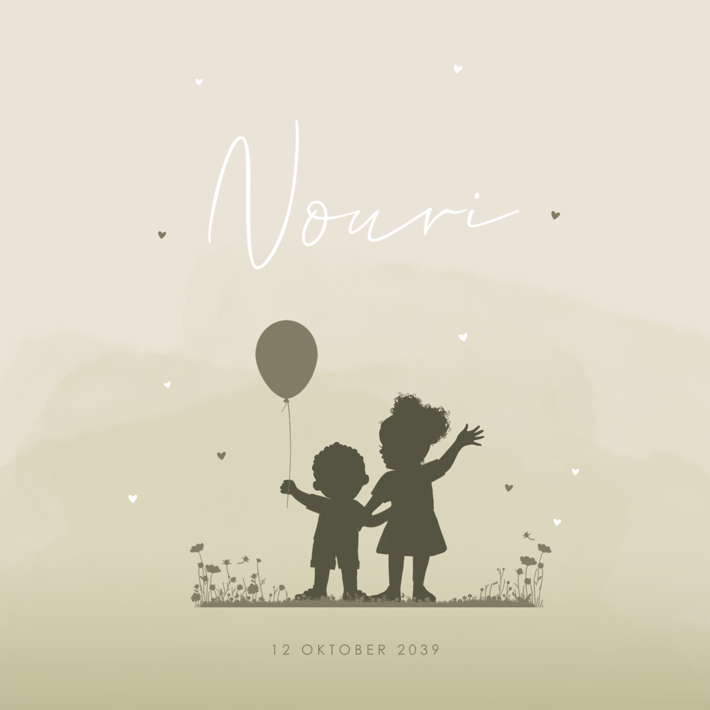 Wat een tof geboortekaartje! Dit groene stijlvolle geboortekaartje is ook perfect voor jullie tweede kindje. Het kaartje heeft twee schattige silhouetjes van jullie oudste dochter en haar jonge broertje. De naam en een aantal hartjes zijn gedrukt in goudfolie. Pas het kaartje naar wens aan in onze online editor.
