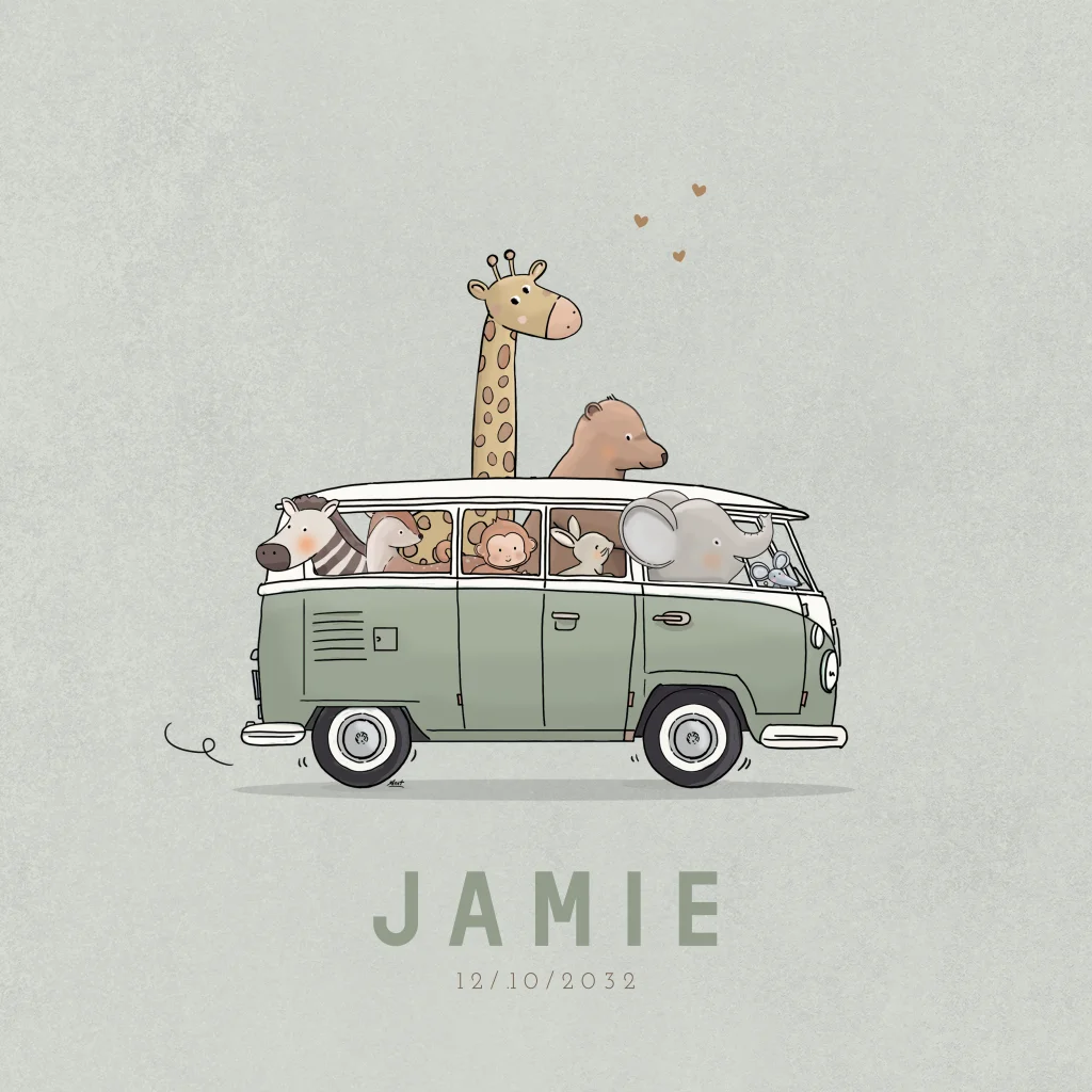 Wat een vrolijk spektakel. Op dit geboortekaartje staan de illustraties van verschillende jungledieren. Het kaartje is naar wens aan te passen in onze online editor.