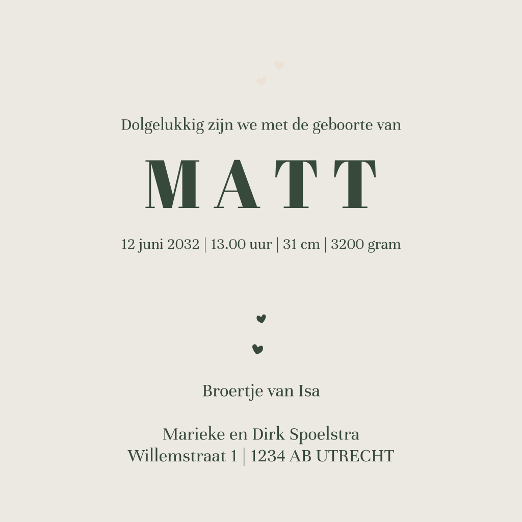 Een stoer groen watercolour geboortekaartje. Dit geboortekaartje heeft een vierkant formaat met ronde hoeken. In het midden van het kaartje zie je een olifantje omringd door hartjes. Pas het kaartje naar wens aan in onze online opmaaktool.