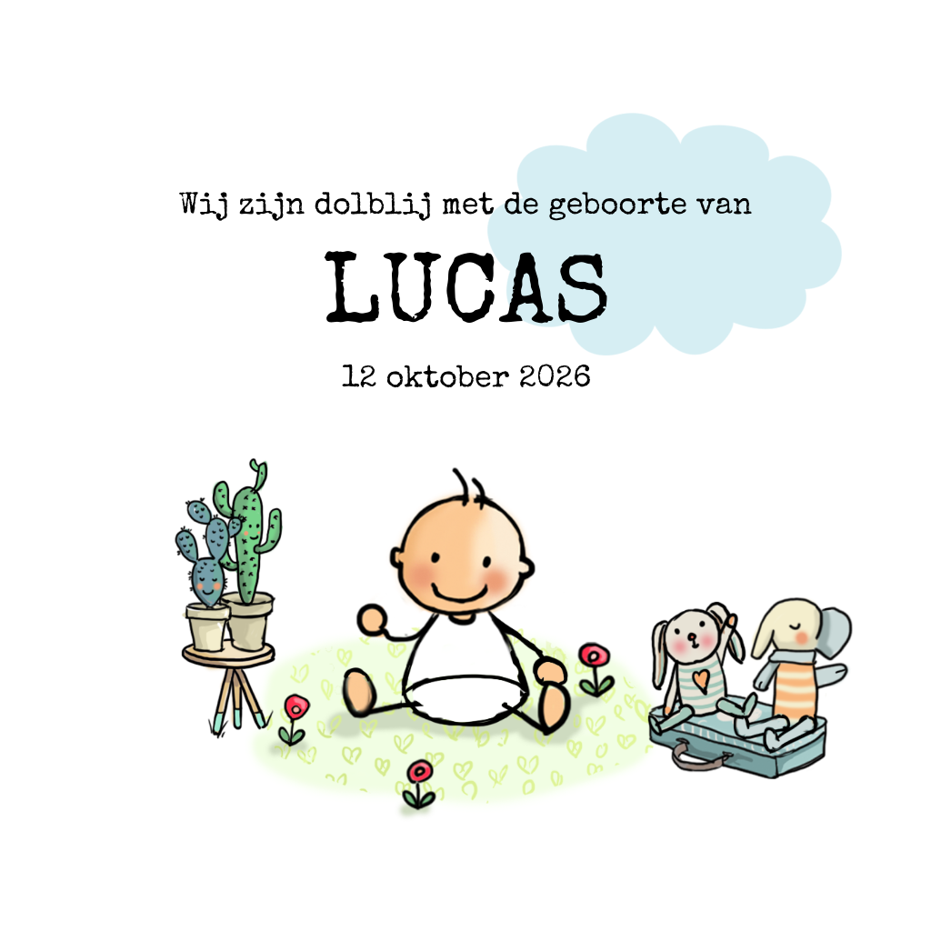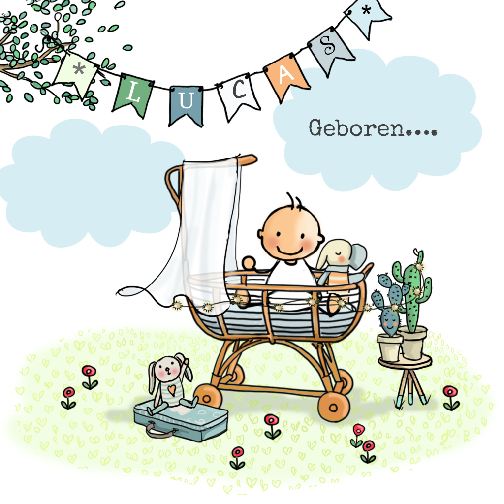 Super lief kaartje van Rotan wiegje met jongens baby en leuke getekende elementen zoals een slinger, cactus, knuffeltjes en waslijn.