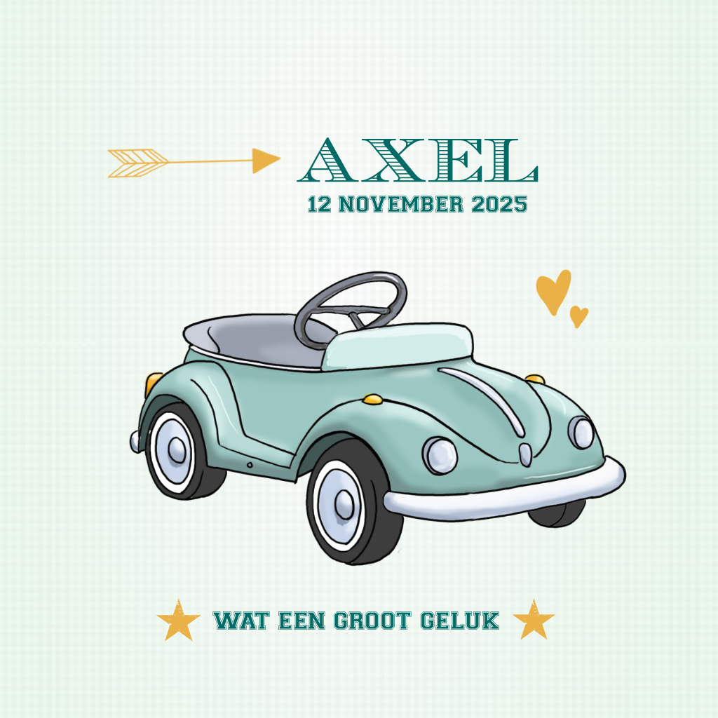 Super stoer kaartje met getekende retro volkswagen kever voor jongen in hippe kleur aqua. Losse illustraties die je nog leuk kunt verschuiven of veranderen.