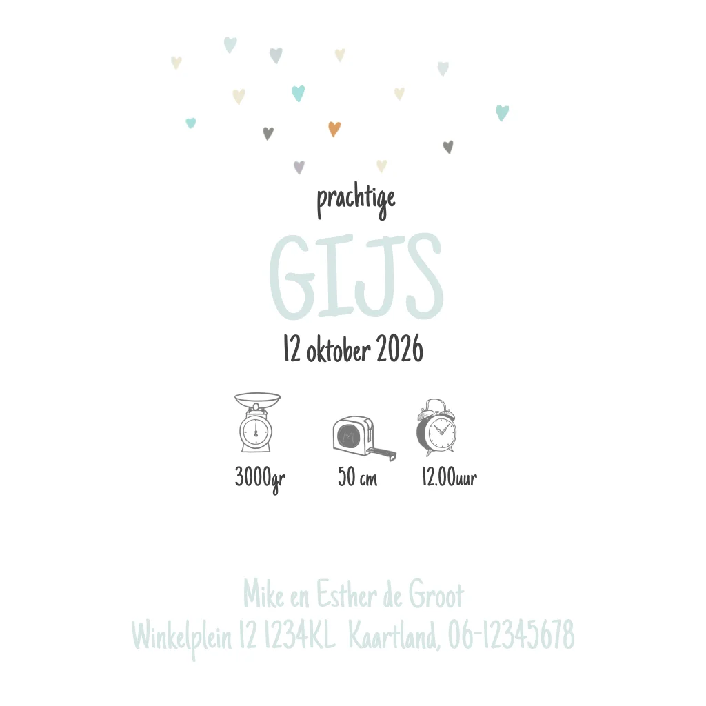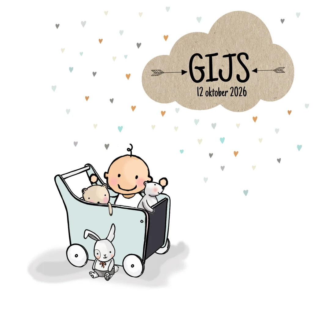 Lief, getekend geboortekaartje voor een jongen met loopkar en stoer kraft wolkje op kleurrijke hartjes achtergrond.